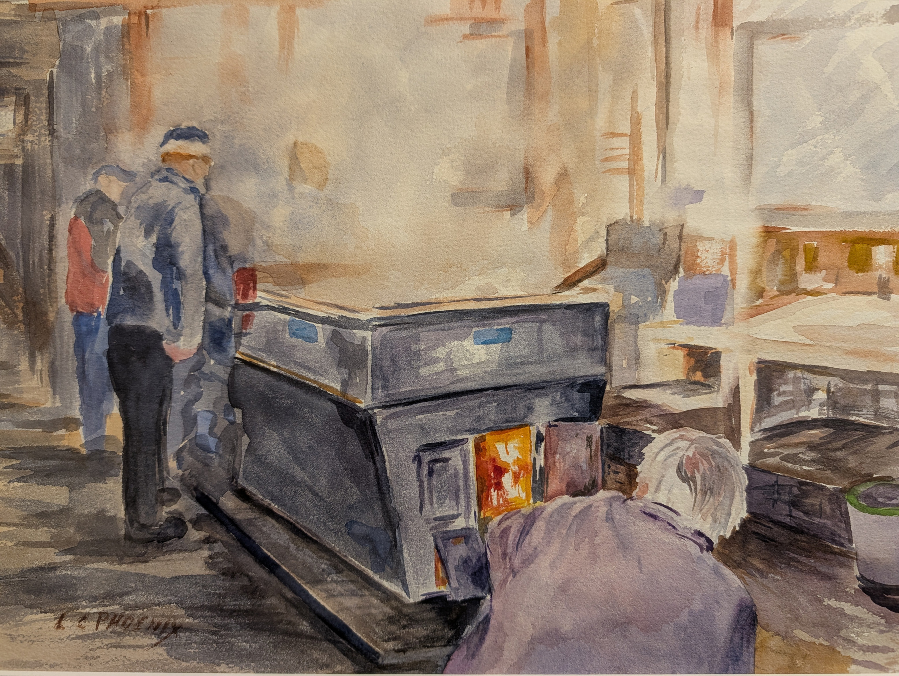 Lee Petty shared this about the painting she contributed to the exhibit, a watercolor by the late Townshend resident and special friend, Lois Phoenix: “It captures the Boiling Down of Maple Syrup in Charlie Marchant’s Townshend Sugar House. Lois, who emphatically declared herself a ‘hobbyist’ rather than an artist, painted local scenes for many years. A long-time member of the Saxtons River Art Guild, her paintings have been shown in many local exhibits and enjoyed by patients in hospitals and medical offices throughout the area.”